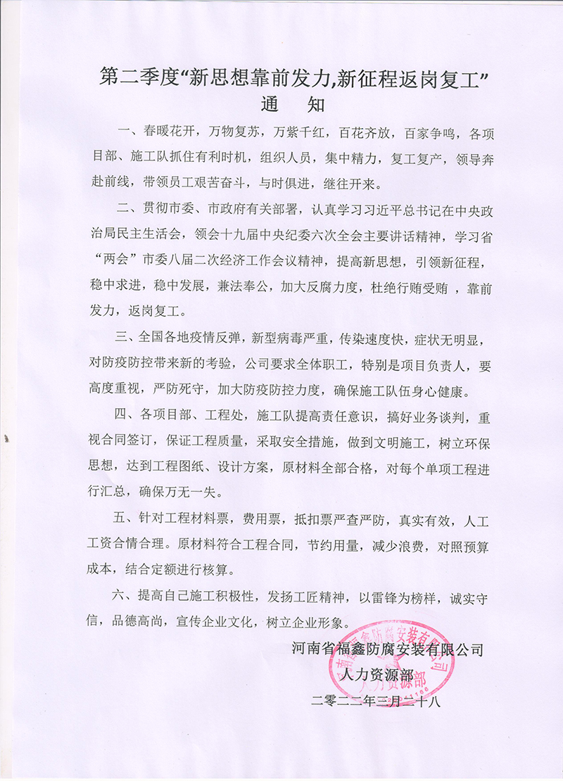第二季度“新思想靠前發(fā)力,新征程返崗復(fù)工”通知